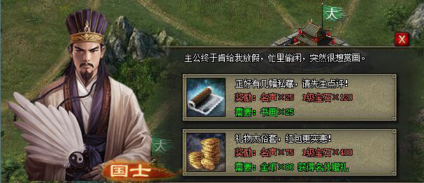 1. 结交名士(或国士)奖励:每次结交,可随机获得经验、粮食、镔铁、宝石、西域锦囊、丝绸(仅限160级及以上)的其中一种选择金币结交,可获得的奖励更多,更有福袋赠礼(额外获得更多一点结交奖励)