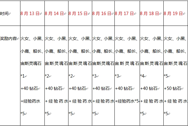 活动内容:从服务器开启后第二天起,连续七天,战队等级高于10级(包括10级)的玩家将在每天中午12:00左右将通过游戏内信箱获得火女、小黑、小鹿、船长、宙斯等灵魂石及其他奖励,每位英雄灵魂石累计获得20个。