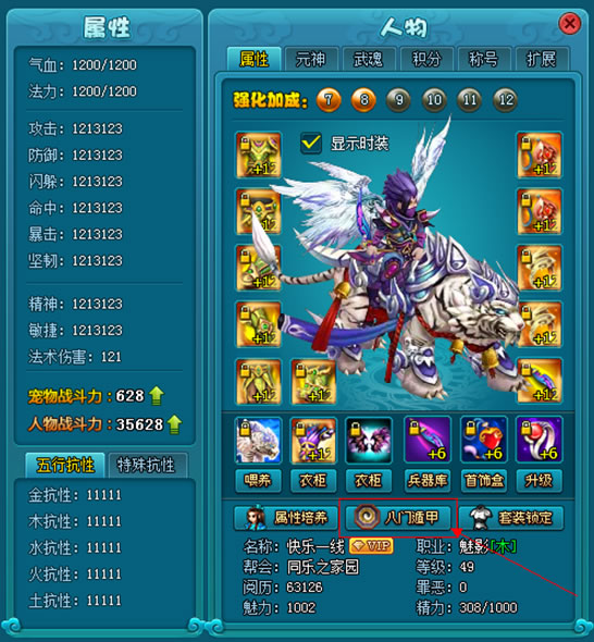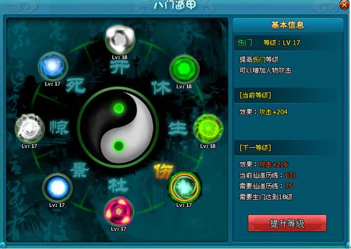 注意:八门遁甲每一门的等级所对应显示的属性为实际属性效果,而非增加的属性值。比如自身的开门等级是1级,属性效果为气血增加60,而提升到2级的属性效果为气血增加120,也就是说开门从1级提升到2级只增加60气血。其他门也是如此。