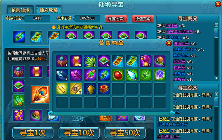 仙府秘境珍藏了极为珍贵的宝物,寻宝50次的奖励如图: