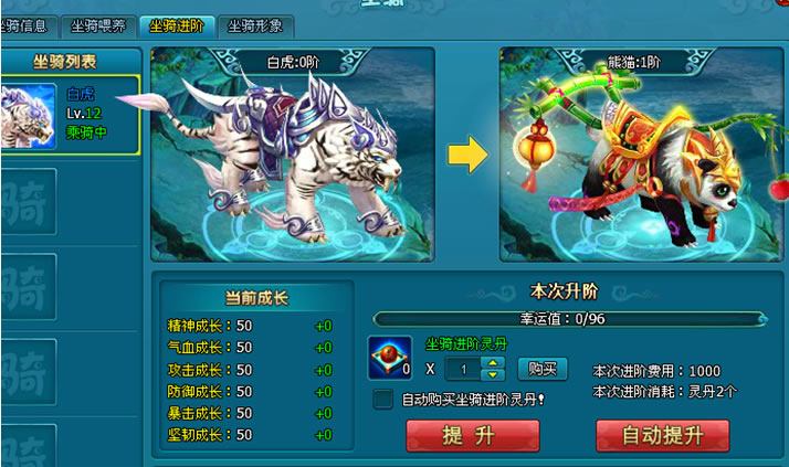 1). 坐骑喂养等级达到12级以上时,可拥有进阶功能。