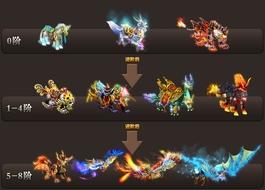 3). 每次进阶后,都可以获得更拉风坐骑外形!坐骑可进化为玄武,麒麟神兽,甚至能够飞行的凤凰与神龙!六阶以上的坐骑天生具有飞行能力,即使人物没有+10翅膀也能骑乘坐骑飞行!