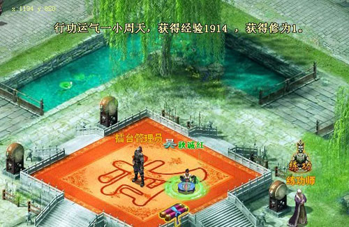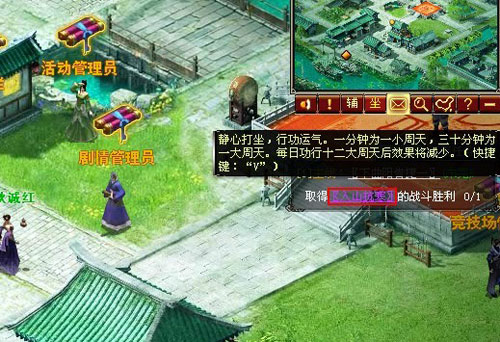 小地图下方新增“坐”按钮,意为修身养气。玩家点击此按钮后,弹出确认面板,玩家点击即进入“打坐”状态。“静心打坐,行功运气。一分钟为一小周天,三十分钟为一大周天。每日功行六大周天后效果将减少。”玩家移动、打造炼制、进入战斗、下线都将取消行功运气状态。