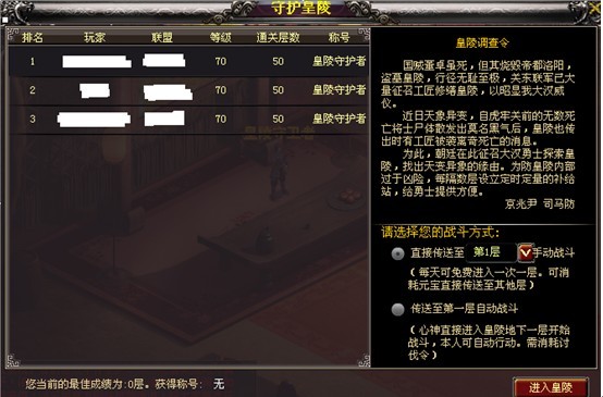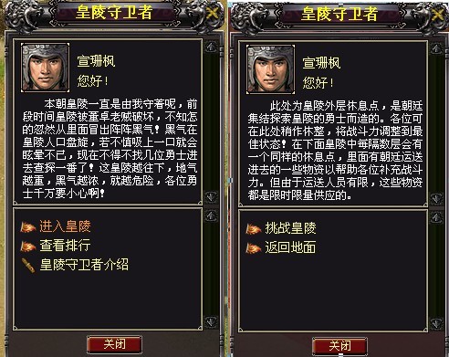 点击NPC对话,选择“进入皇陵”,这时进入的是皇陵休息室;在这里可以与NPC皇陵守卫者对话,选择“挑战皇陵”或者“返回地面”。