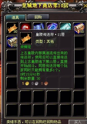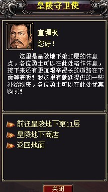 5、皇陵中每隔十层有休息点,在此处有皇城地下商店;越高楼层的皇城地下商店出售的道具越稀有;皇城地下商店出售的道具有数量限制且限时刷新。