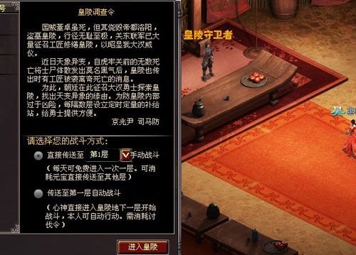 战将Online全新“上古皇陵系统”将给予玩家更另类的游戏体验。玩家从虎牢关处点击NPC进入皇陵,传送到的是“皇陵外层休息点”,从外层休息点NPC处再选择进入战斗。点击“皇陵守卫者”挑战皇陵,即可开始在皇陵探寻宝藏了。“上古皇陵”总共有99层,深入层次越高挑战难度越大,可探寻宝藏越多。