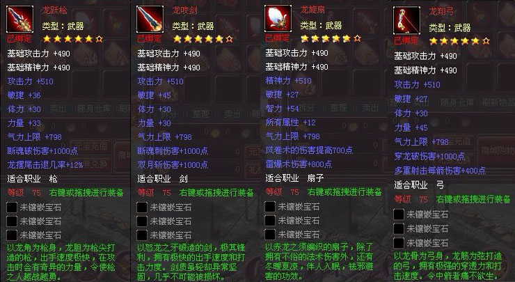 龙跃枪,需求等级75,以龙角为枪身,龙胆为枪尖打造的枪,出手速度极快,在攻击时会有奇异的力量,令使枪之越战越勇。基础攻击力:+490,基础精神力,+490,攻击力,+510,敏捷,+36,体力+30,力量+33,气力上限+798,断魂破伤害+1000点,龙摆尾击退几率+12%。