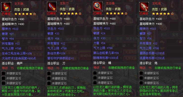 龙灵葫,需求等级75,以赤龙之心雕刻而成的葫芦,拥有一个慈悲为怀的灵魂,能令医者发挥强大的力量。基础攻击力,+490,基础精神力,+490,精神力,+510,敏捷,+27,智力,+54,所有属性,+12,气力上限,+798,生命之吼生命上限,+10%,大治疗术上命回复,+900点。